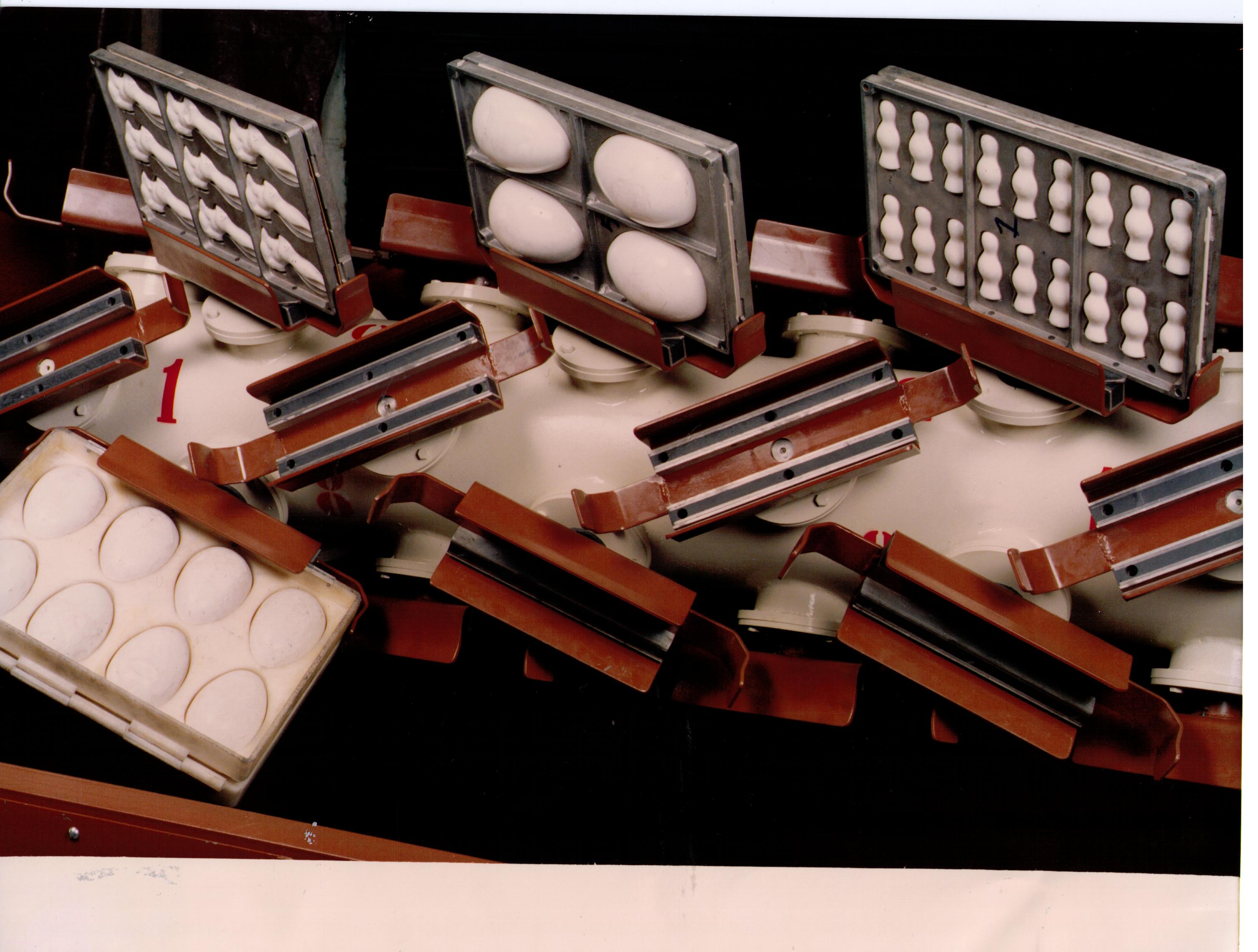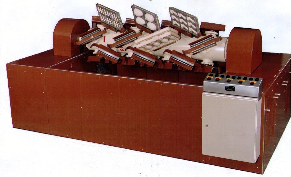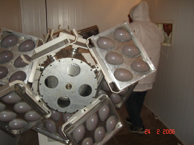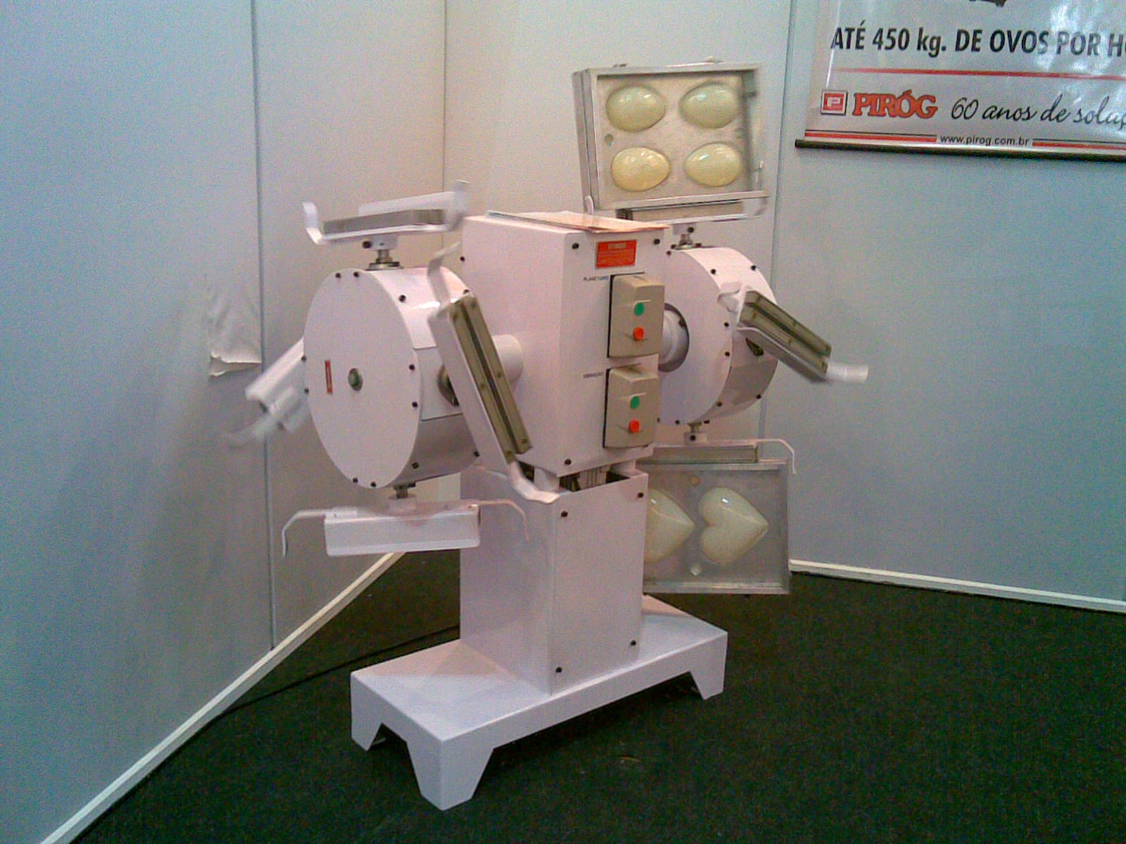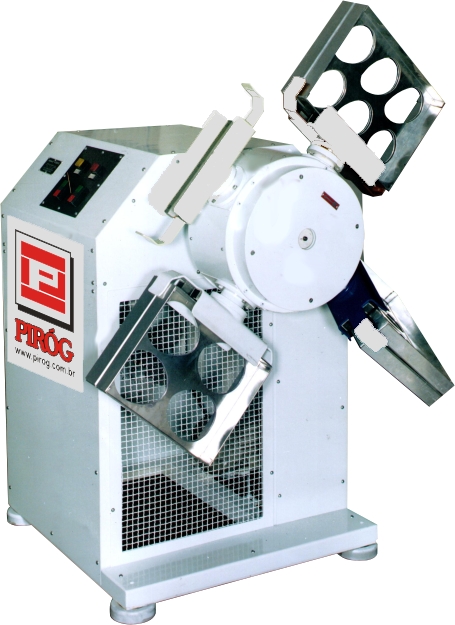 Descrição: A centrífuga é utilizada para formação de corpos ocos de chocolate, distribuindo a massa de forma uniforme nas formas. Possui sistema de vibração e engrenagens para movimentar os porta livros. O equipamento deve ser instalado em cabine refrigerada entre 5° e 8° graus C para a cristalização e resfriamento do chocolate.