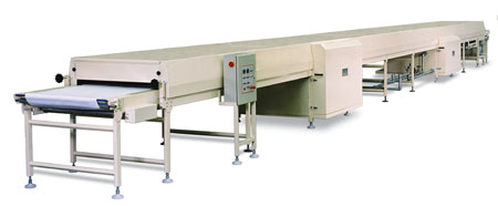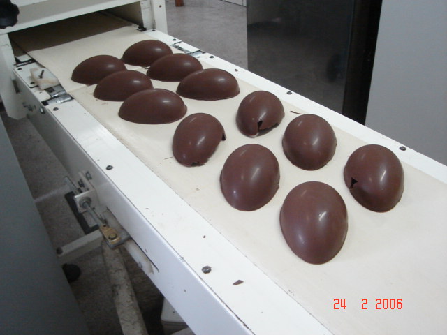 O túnel de resfriamento para chocolate é construído com estrutura de aço caborno, capotas e lastro de fibra isolada com poliuretano expandido em módulos de um metro que permite desmontagem fácil e rápida limpeza e uma eventual manutenção. O evaporador e o forçador de ar estão isolados no centro do equipamento e na parte inferior do túnel com distribuição perfeita de ar em toda área por onde passa o produto. A velocidade da lona é controlado por inversor de frequência com painel elétrico instalado no equipamento ou a parte.
